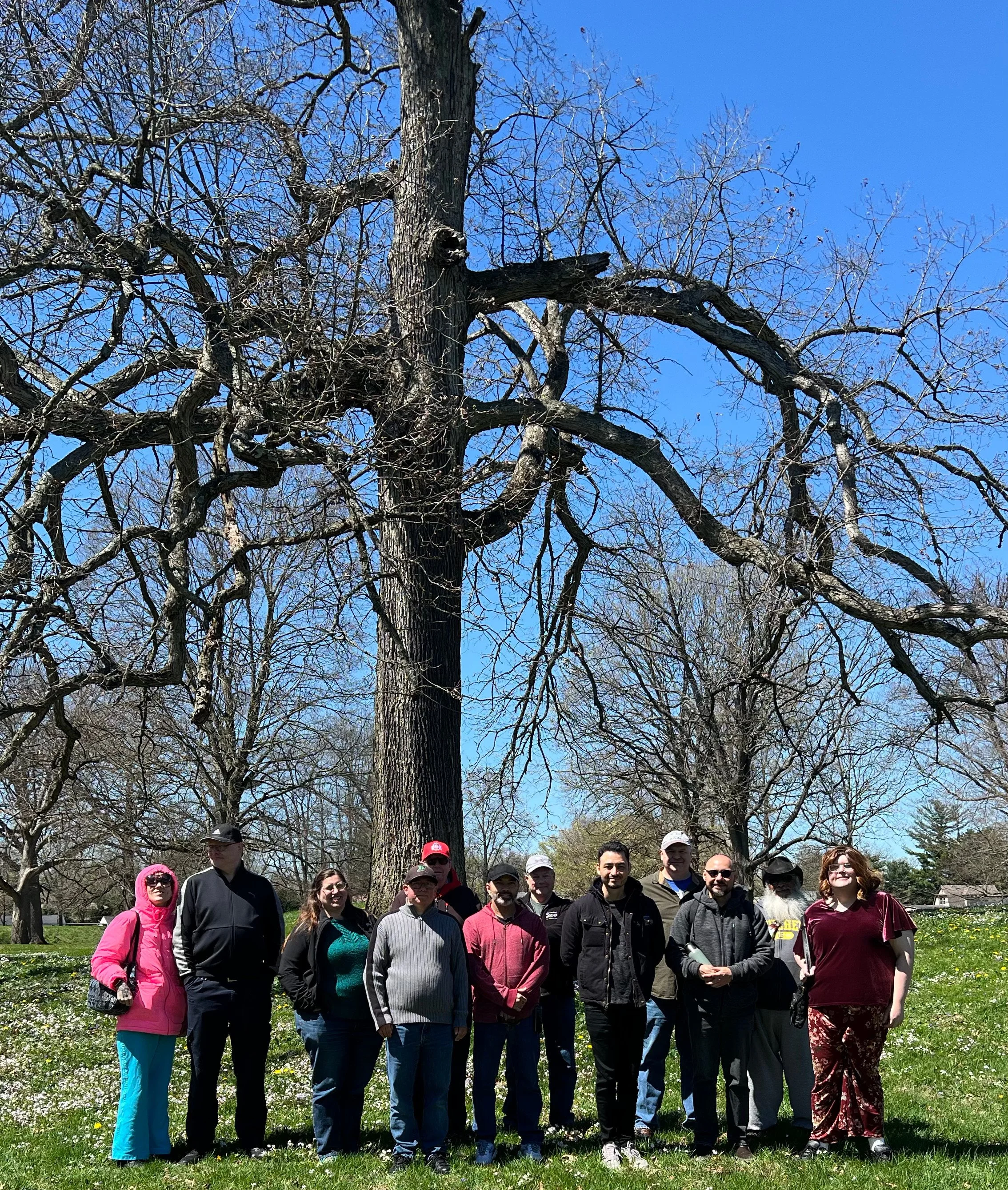 HCCO Members in take a picture in front of a 300 year old oak tree at Eagle Mound, which is at the center of an ancient 1,200 foot diameter earthen circle built by an ancient civilization
